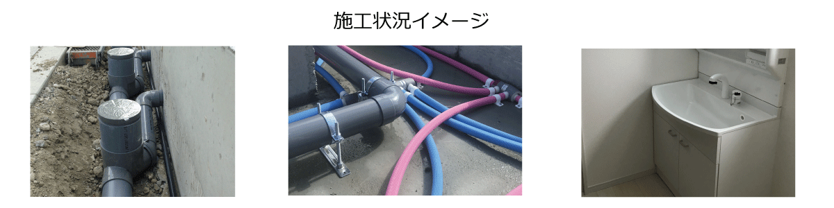 基本工事としてキッチン・洗面台・洗濯パン・1Fトイレ・外部水栓1ヶ所・ガス給湯器接続配管(本体据付は別途)を基本工事とし一式工事で承っております。 |